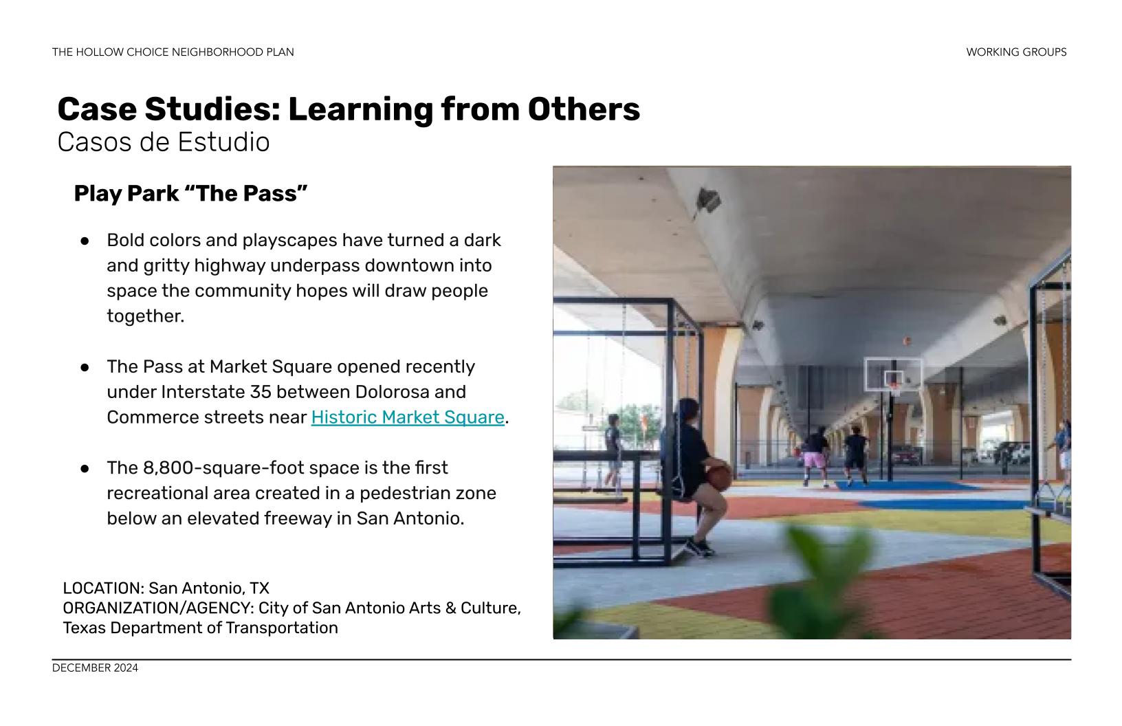 The Neighborhood Working Group focused on improving transportation, mobility, open space, recreation, and cultural identity. Key projects included expanding on-demand transit, improving walkability and pedestrian safety, activating parks like The Hollow Plaza, supporting cultural events like Taste of the Hollow, and enhancing neighborhood identity.